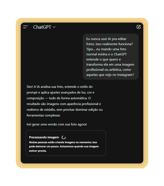 A IA entende seu rosto e seu estilo, transformando qualquer foto em algo que parece feito em estúdio. Cada detalhe é processado com precisão.